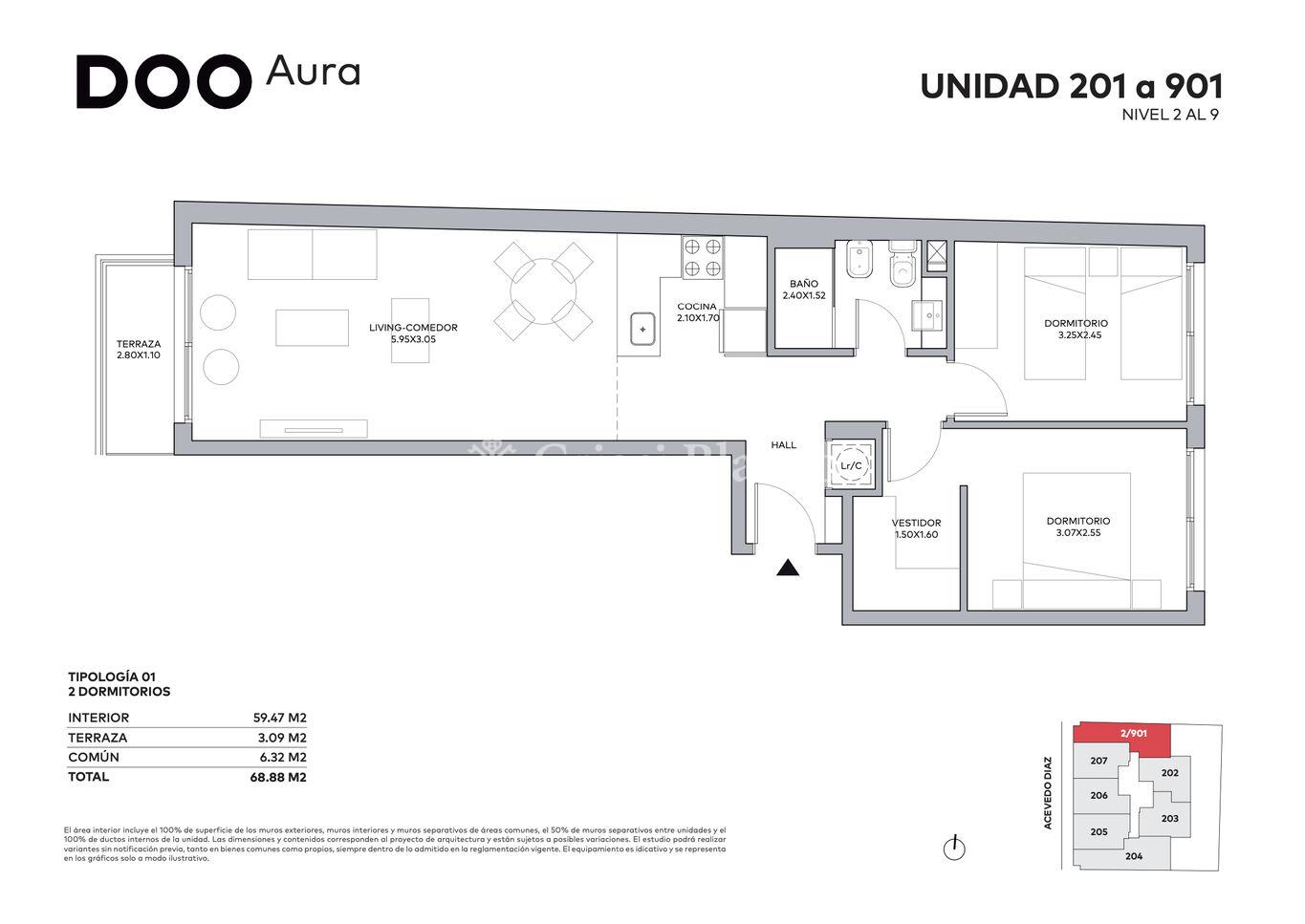 Unidad al frente hacia Acevedo Díaz, 59,47 m2 internos y 3,09 m2 de terraza.