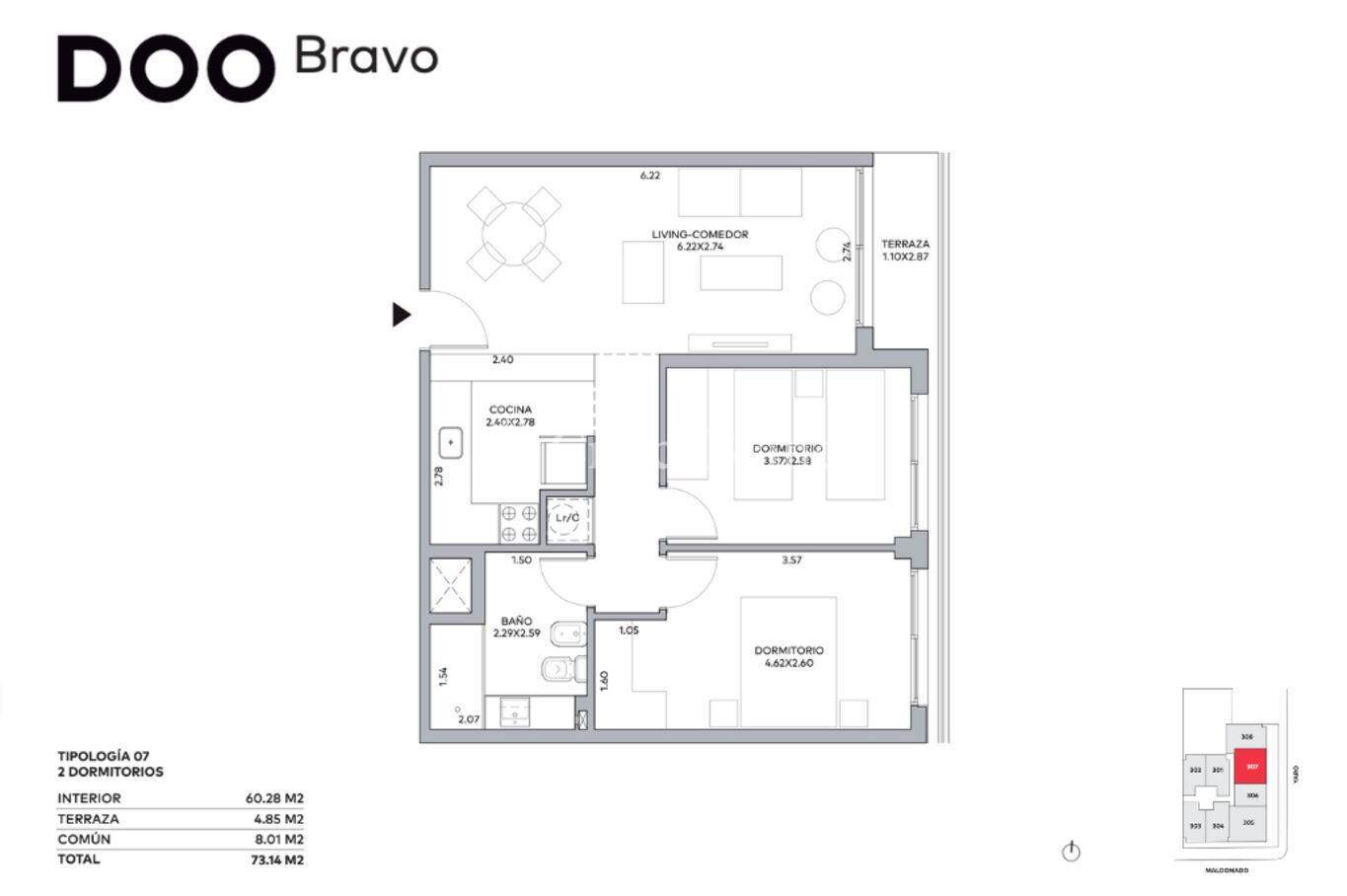 Unidad de 60 m2 internos y terraza de 5 m2. Orientación este.