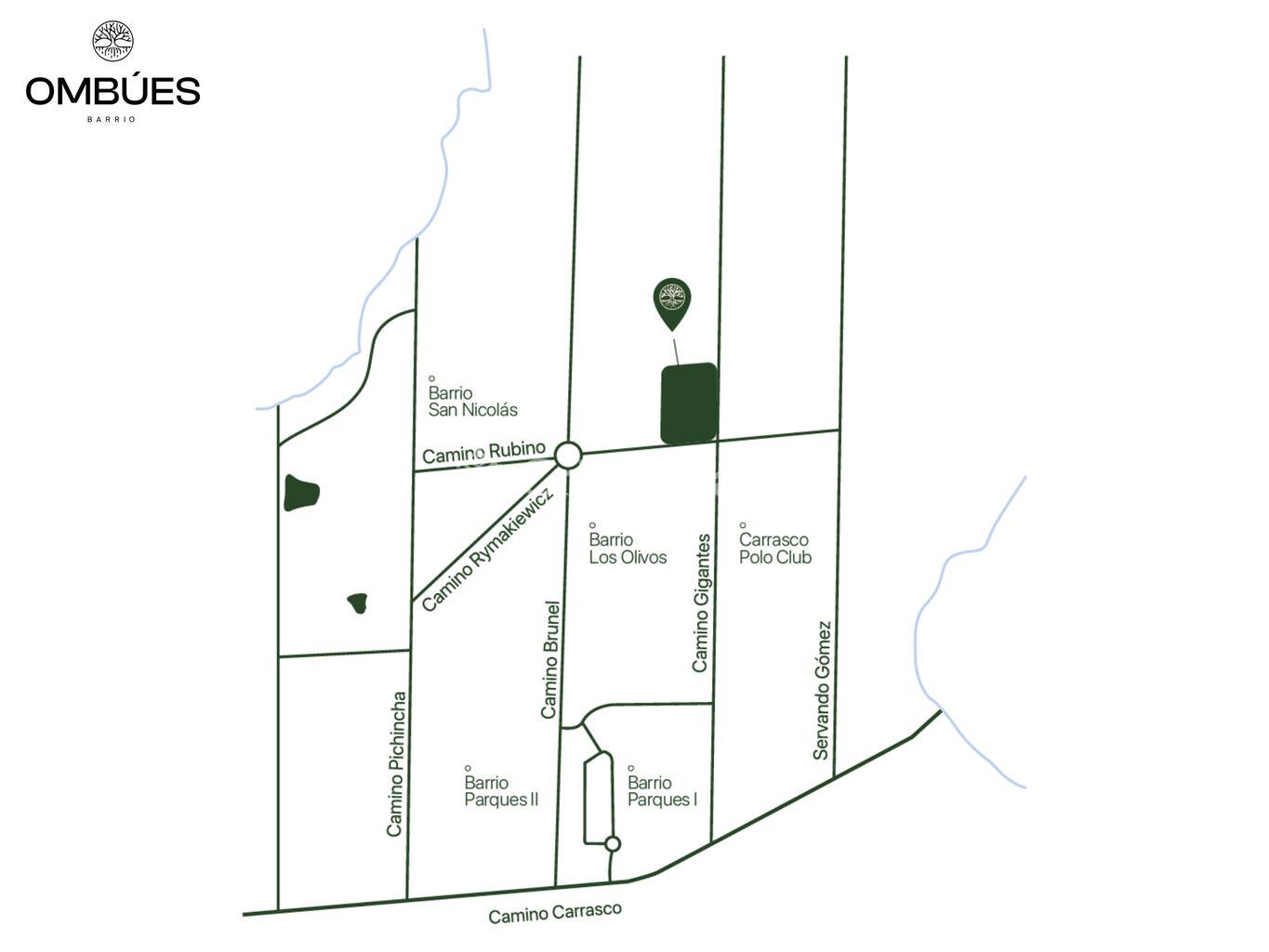 Ombúes se encuentra en Carrasco Norte, con ingreso por Camino Rubino y Gigantes, justo frente a Barrio Los Olivos y a pocos metros del Carrasco Polo.