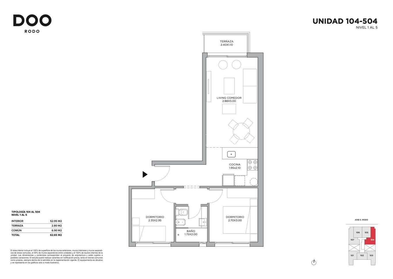 Unidad al frente, primer piso, orientación norte. 53 m2 internos y 2,8 m2 de terraza.