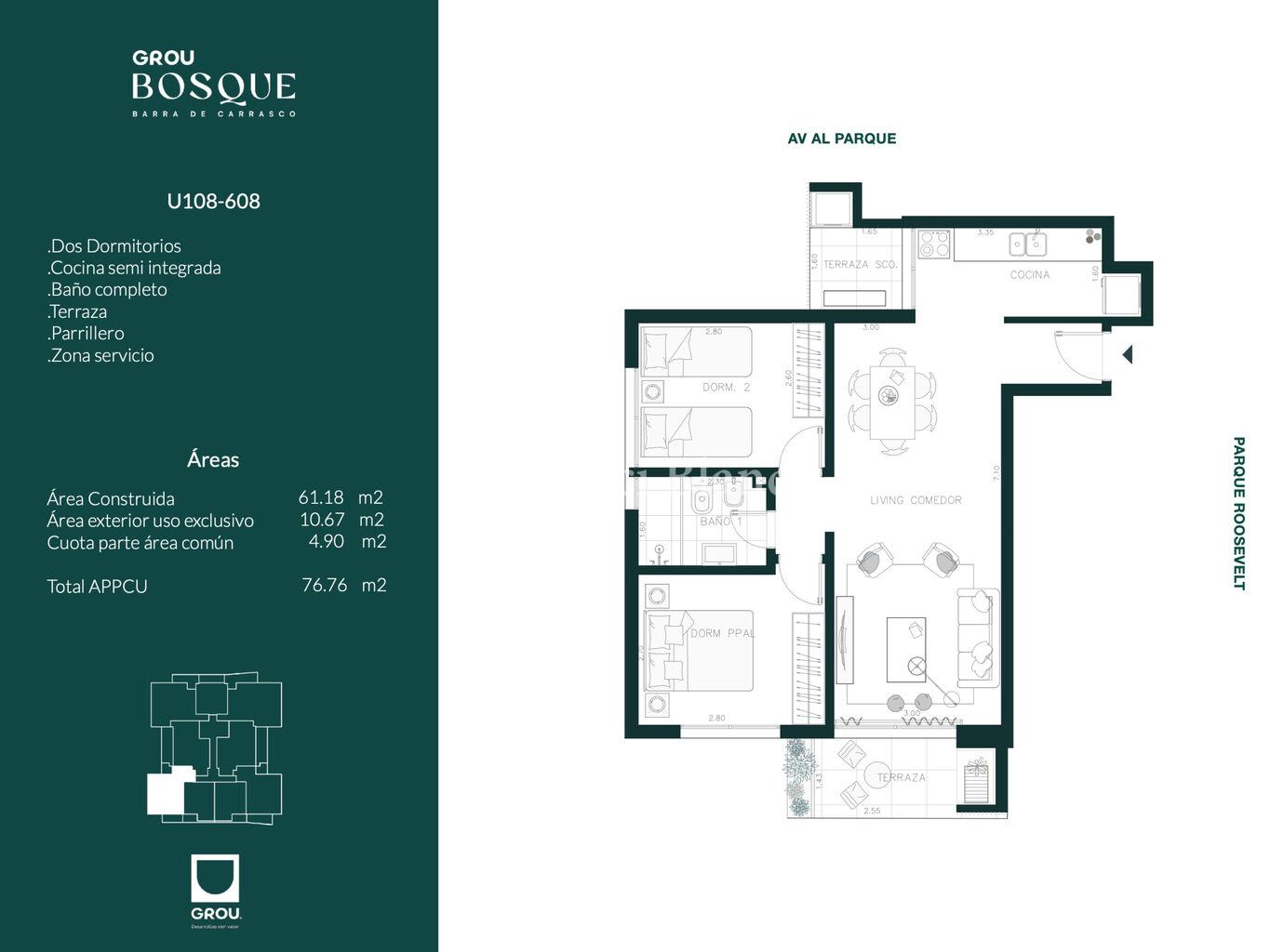 61,18 m2 internos y 10,67 m2 de terraza. Orientación sureste.