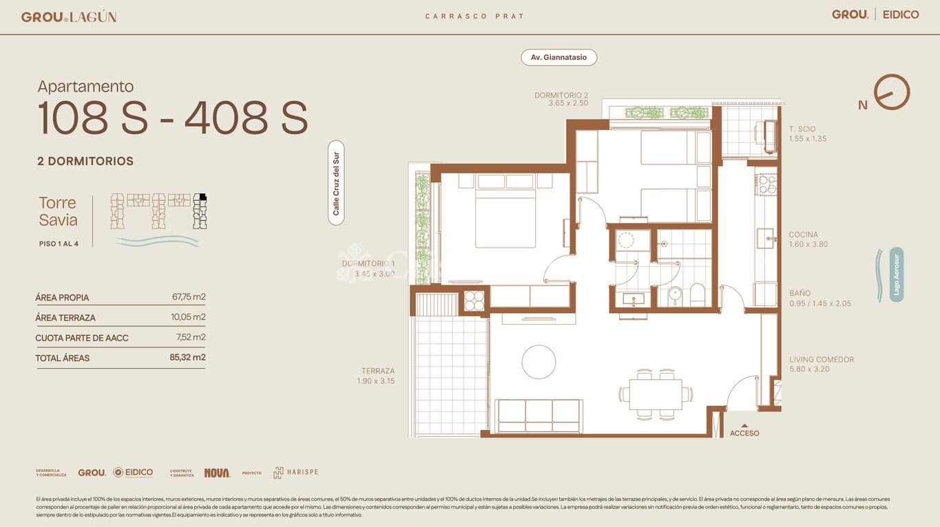 68 m2 internos y 10 m2 de terraza.
