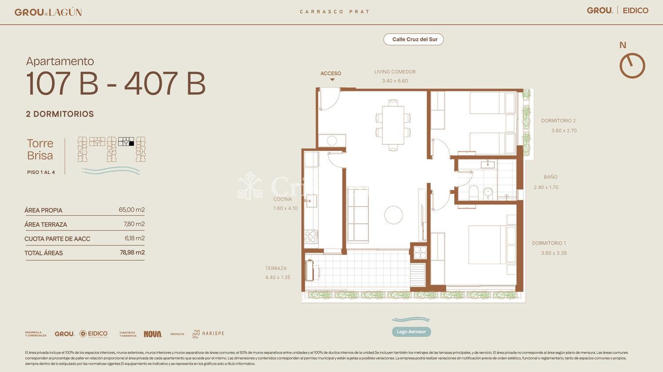 65 m2 internos y 8 m2 de terraza.