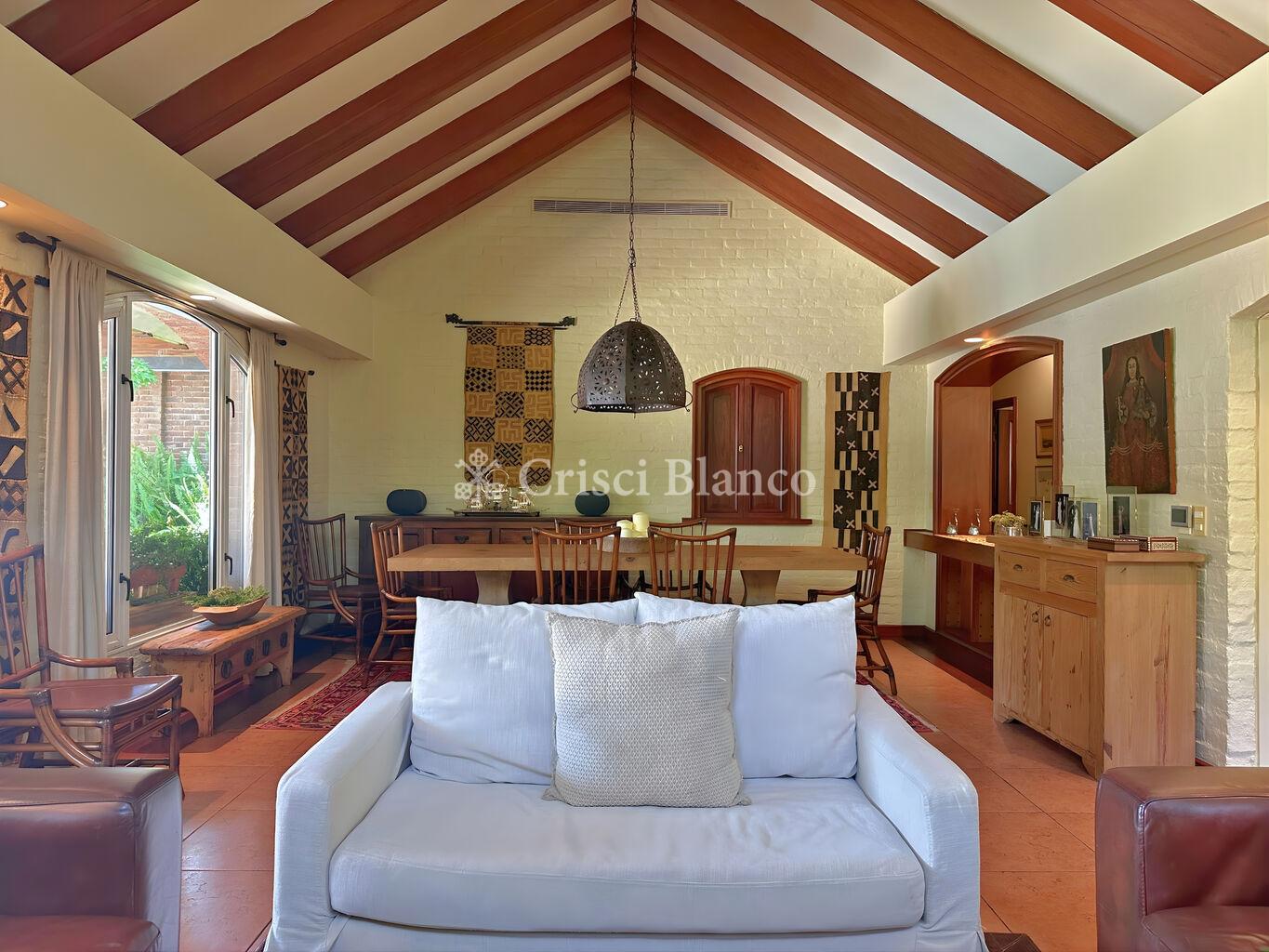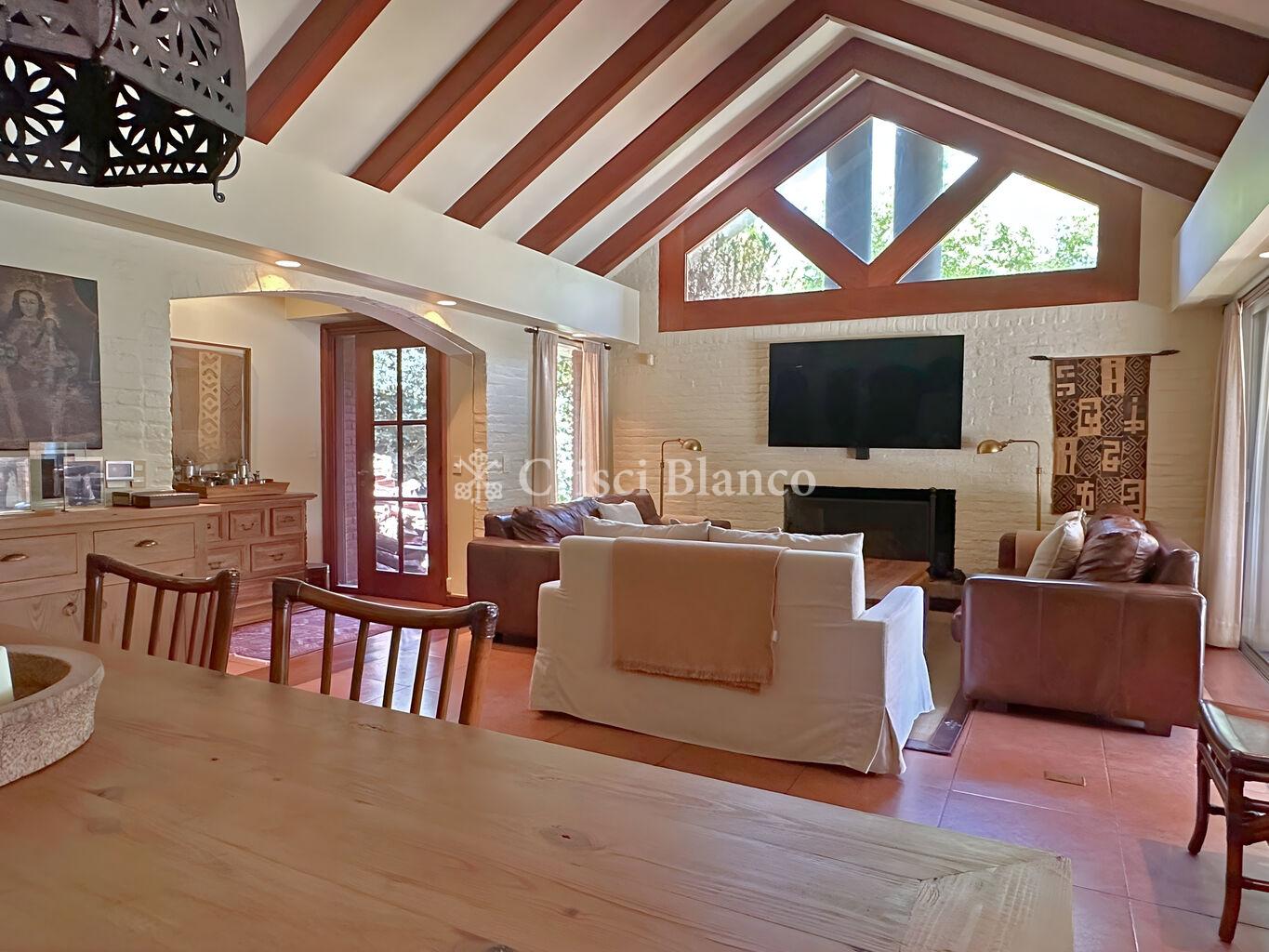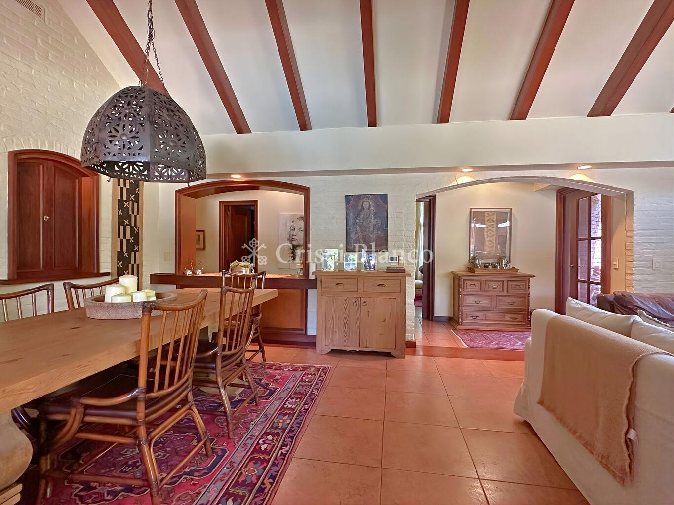 Hacia el fondo un gran estar con comedor diario con estufa a leña tradicional y salida directa a galería techada. Baño social.
