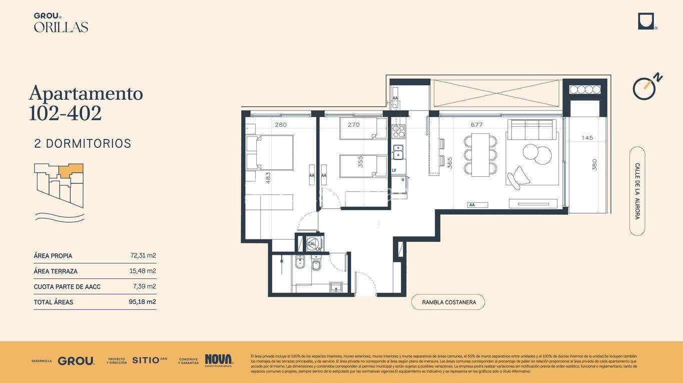 Venta apartamento de 2 dormitorios de 72 m2 interiores y 15 m2 de terraza. Orientación noreste.